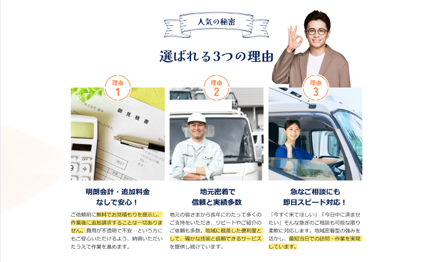 | 追加料金 | お客様にご確認の上でのみ発生 | 勝手な追加料金のリスクがありません。 |